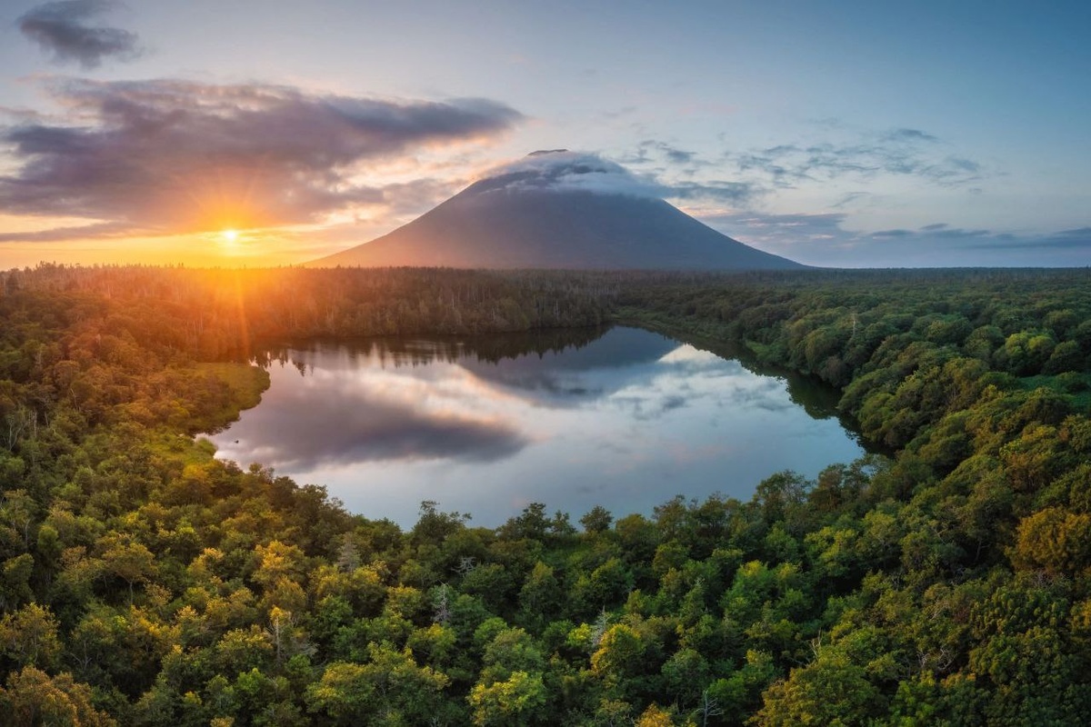 Вулкан Атсонупури и озеро Наташа. Южная часть острова Итуруп, Курилы.