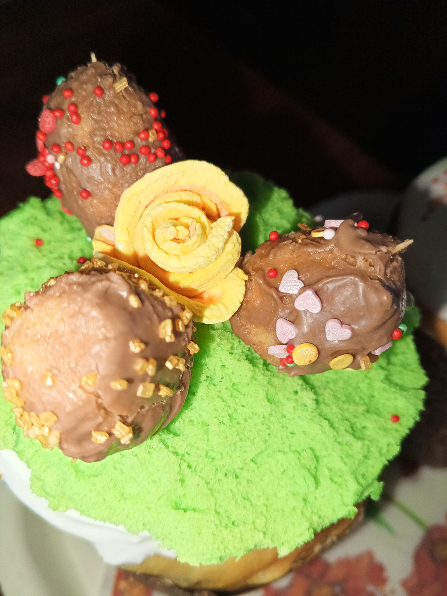 Решила в этом году поукрашать куличи как-то эдак. Во-первых, решила сделать мох. Нашла простой рецепт. Получился просто на ура! 1 яйцо, 1 ст.ложку сахара, 1 ст.ложку муки, 1 чайную ложку разрыхлителя. Все взбить миксером. Добавить зелёный краситель. Я взбивала в большой кружке, в ней же и пекла. 1.5 минуты в микроволновке. Получился отличный мох. Разделила руками, чтобы сохранить пористую структуру. Второе украшение - шоколадные яйца. Для начала испекла бисквит. 1 яйцо, 1/4 стакана сахара, 1/4 стакана муки, немного разрыхлителя. Взбила, вылила на противень, испекла до готовности. Остудила. Разломала на кусочки, положила в блендер. Пробила до мелкой крошки. Сделала крем. Сливочное масло взбила вилкой. Добавила сгущёнку. Взбила вилкой Смешала крошку с кремом Из массы налепили колобочков, похожих на яйца. Положила в морозилку на часок. Вытащила. Обмакнула в растопленный шоколад и посыпала посыпками. Вот так на куличей смотрятся яйца. Не стала снимать со шпажек, т.к. в тепле тают. Вот т