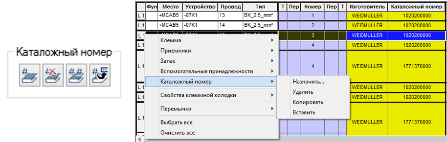 Вставить номер по каталогу – Назначение выбранной клемме (клеммам) ранее скопированных в буфер обмена каталожных данных, в том числе свойств клеммы.