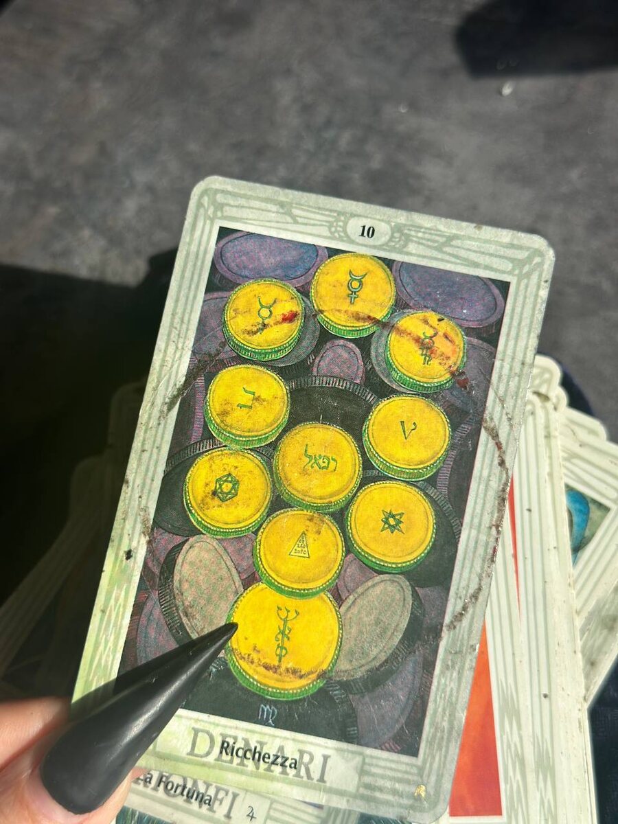 В Таро Тота существует понятие "покачать на аркане" или "повисеть на аркане". Это самый простой вид коррекции. Я не раз рассказывала об этом! Самый частый и востребованный вариант — покачать себя или клиента на 10 дисках. Это значит привлечь в жизнь энергию этой карты, а 10 дисков — это деньги. Как делаем: 1. Берем карту Таро Тота — 10 дисков. 2. Находим свое фото, где мы находимся в одиночестве. 3. Подготавливаем зеленую свечу. 4. На свече пишем сумму, которую хотим привлечь. 5. Кладем на карту свое фото, сверху ставим зеленую свечу. 6. Зажигаем свечу от спички. 7. Проводим медитацию. Можно просто сесть и четко представить, как нужная сумма приходит. 8. Свеча должна полностью прогореть.