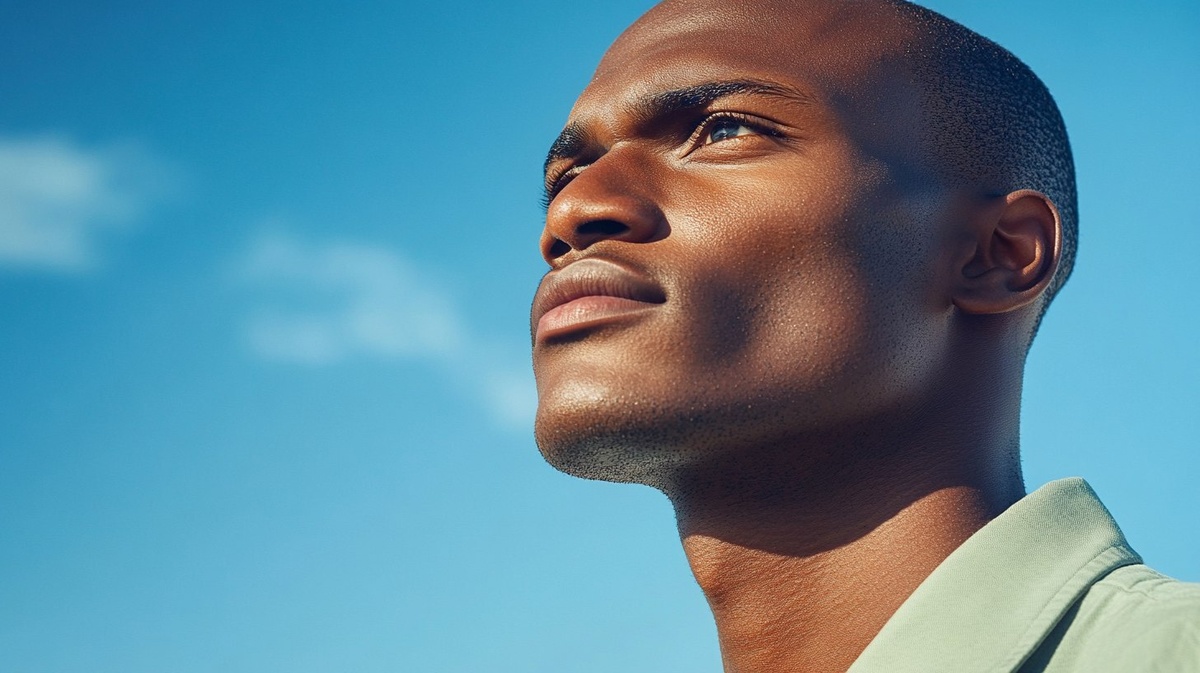 Создано на основе запроса: extreme close up, black male 40 years old, clean, short hair, looking into distance, blue sky baclground, real