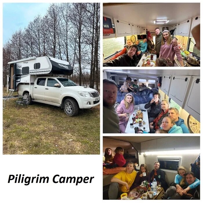 Конечно это шутка, и никто не планировал ставить рекорды по вместимости модуля Пилигрим. Хотя есть и такие примеры)) Но сегодня просто поехали пожарить на природе шашлык, заодно снять пару роликов про жилой модуль. Вот он, кстати. На Тойоте Хайлюкс. Модуль самый комфортный из всех возможных на таком небольшом пикапе. Имеет внешние габариты 415*210*205 см, вес примерно 800 кг, запас воды 80 литров, автономен по электричеству и теплу. Одно из преимуществ - имеет вход сбоку, что намного расширяет возможности использование задней стенки. В этом случае мы поставили велобагажник. А можно вешать запасное колесо или канистры для топлива. А самое главное что существенно улучшилась обитаемость модуля внутри. Имеет 3 полноценных спальных места 200*140 см и 200*80 см. Полноценную столовую зону (кают-компанию) Комфортную спальную зону со шкафами для вещей. Множество полок, шкафов и рундуков для вещей и багажа. Полноценную кухню с необходимой бытовой техникой - плита газовая, мойка с горячей водой,