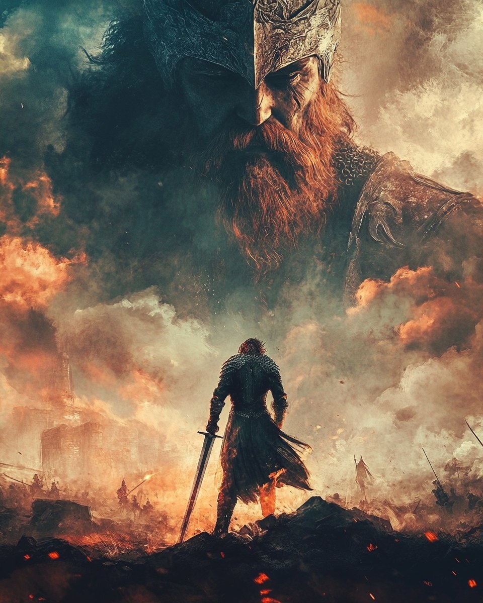 Создано на основе запроса: epic grunge poster, medieval warrior raising his sword in a battlefield during a battle, while in the sky an evil king, old with red beard is watching him, zack snyder aestethic, --- Автоперевод: Эпический гранж плакат, средневековый воин, поднимающий свой меч на поле битвы во время битвы, а в небе - злой король, старый с красной бородой наблюдает за ним, Зак Снайдер эстетит, Как тебе картинка? 🤔 https://dzen.ru/id/65c0c65c86e4f837c27b24d7 #ИИ #AI #нейросеть #midjourney #art