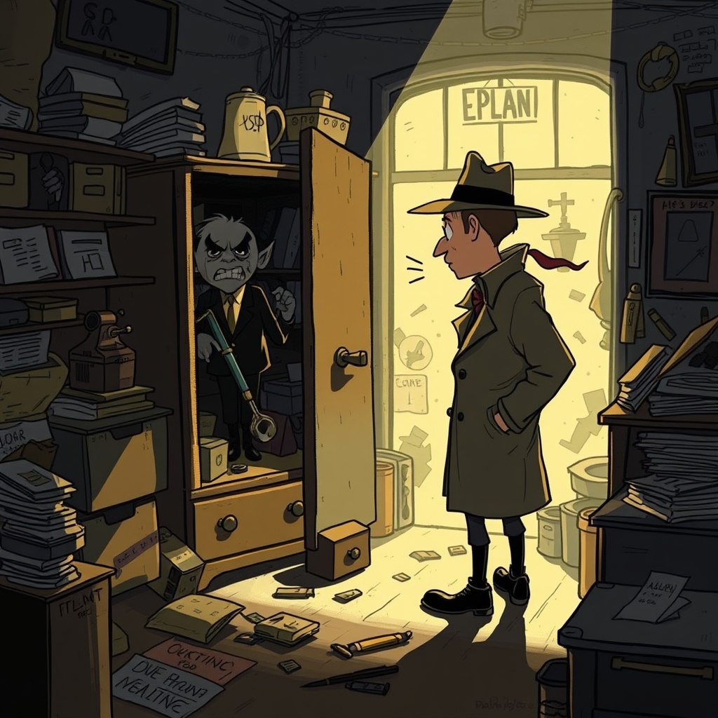 Главный герой моего рассказа — Еплан. Да, именно так его и звали. Он был детективом, но таким, что после встречи с ним пропадало желание вообще жить по правилам логики. Еплан жил в съёмной квартире, где обои шептали о твоих ошибках, а унитаз иногда плакал. Всё началось с дела орущего шкафа. Однажды к нему зашла клиентка — девушка с глазами, как две плохо протёртые линзы, и сказала: — У меня орёт шкаф. Еплан задумался. На секунду. Потом спросил: — А ты точно его не обидела? Клиентка заплакала, достала банку с маринованным бананом и ушла. Так началось его расследование. **Он вызвал своего друга — старого наркомана Васю, который был специалистом по разговорам с мебелью.** Вася посмотрел на шкаф, шёпотом сказал: — Этот шкаф видел вещи, о которых лучше не знать, брат. А шкаф в этот момент заорал: — Я знаю, кто украл твой мозг, Еплан! Еплан, не моргнув, ответил: — А я знаю, кто спёр мой душевный покой — жизнь. Дальше пошли галлюцинации: Стены поплыли. Пепельница превратилась в полицей