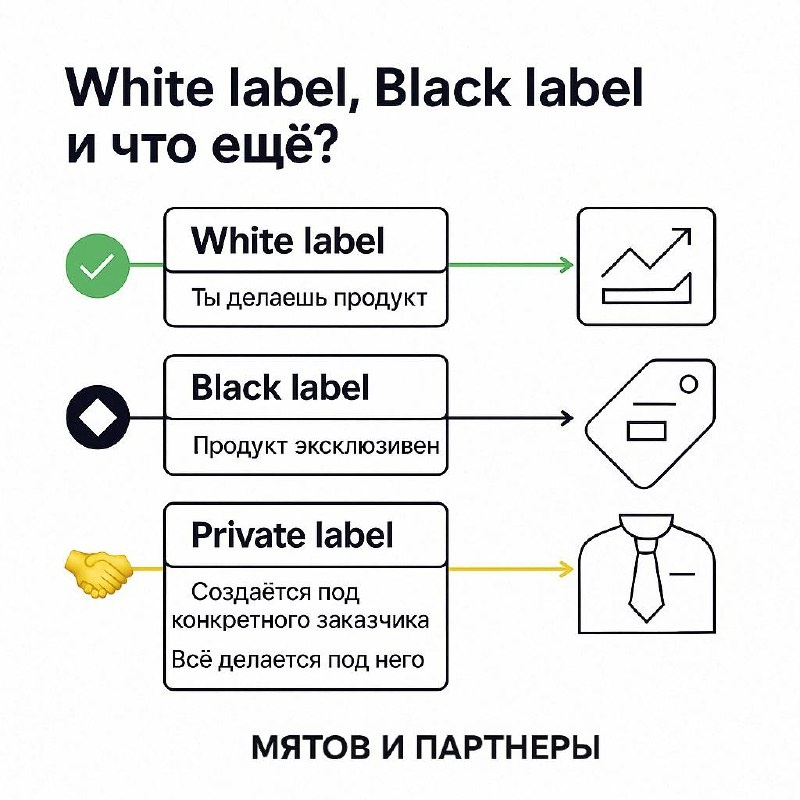 White label, Black label и что ещё? В digital-е и бизнесе часто слышим: white label, black label… Что это вообще такое — и чем они отличаются? ✅ White label — ты делаешь продукт, а кто-то другой продаёт его под своим брендом. Никакой славы, только деньги. Ты — призрак. Но масштаб возможен запредельный. 📌 Пример: ты запускаешь SEO-продукт или PBN-сеть, а десятки агентств продают это клиентам как «свой сервис». У тебя — стабильный кэш, у них — фасад экспертизы. ✅ Black label — наоборот. Продукт эксклюзивен. Он для "своих", под особым знаком. Часто дороже. Часто круче. Часто непонятен массам — и в этом сила. Ты — не для всех. И это осознанный выбор. 📌 Пример: российские креативные агентства, работающие только с люксом или политтехнологиями. У них нет сайта, нет кейсов — всё из уст в уста. ✅ Private label — продукт создаётся под одного заказчика. Как кастомный костюм. Всё под нужды одного бренда. 📌 Пример: Wildberries и Ozon делают свои линейки одежды и бытовой химии — не сами, к