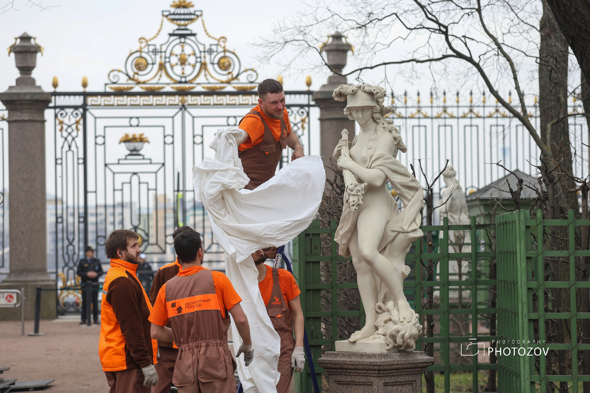 В Летнем саду раскрыли скульптуры после зимы. Деревянные футляры сняли со всех скульптур сада. Помимо футляров, статуи были дополнительно обернуты холщовой тканью, что обеспечивало защиту от снега и влаги. Практика закрывать скульптуры на зиму существует с XVII века. Она продолжается до сих пор, несмотря на то, что в саду находятся копии тех скульптур, что были установлены ещё при Петре I. Оригиналы же размещены в Михайловском замке. Освободилась от деревянного короба и скульптурная группа «Ништадтский мир». Кстати, это первый мраморный памятник в России, заказанный лично Петром Первым. А еще он единственный оригинальный памятник, оставшийся в Летнем саду. И единственный, который стоит не под деревьями. Липовый сок портит мрамор, что стало одной из причин переноса всех изваяний в Михайловский замок. Но увидеть красоту в мраморе пока невозможно, так как Летний сад закрыть на просушку. Он откроется для посетителей в начале мая.