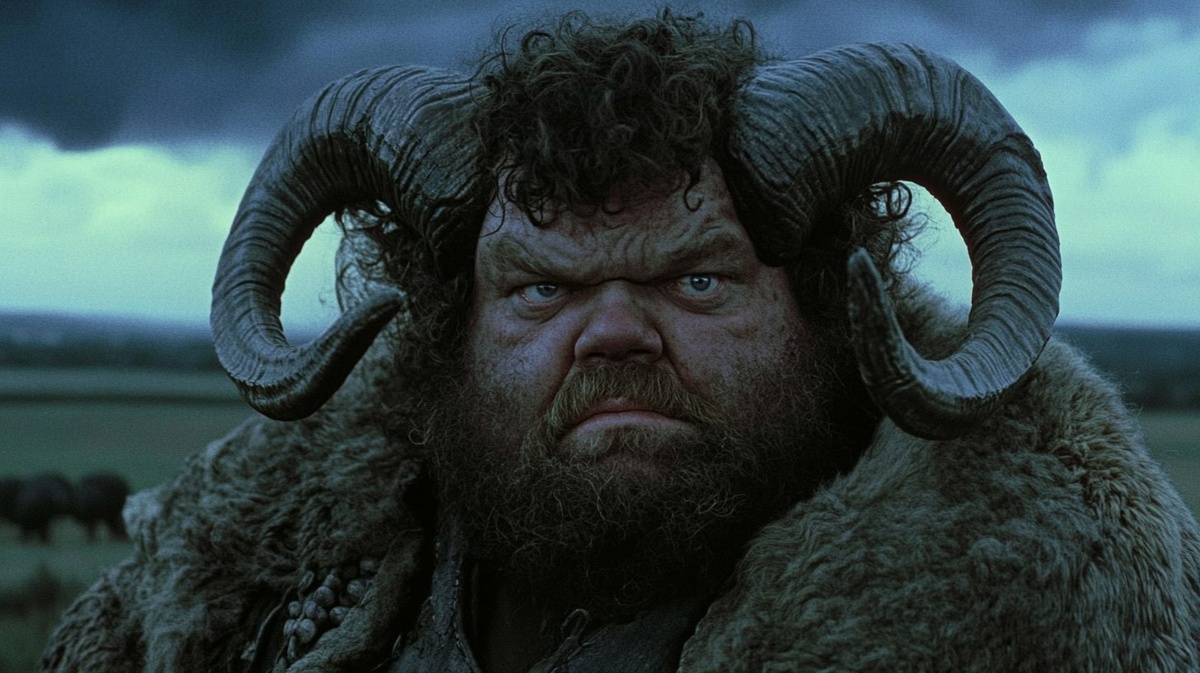 Создано на основе запроса: a single frame from a 1980s dark fantasy film, a fat man with a beard and ram horns, curly hair and fur, center