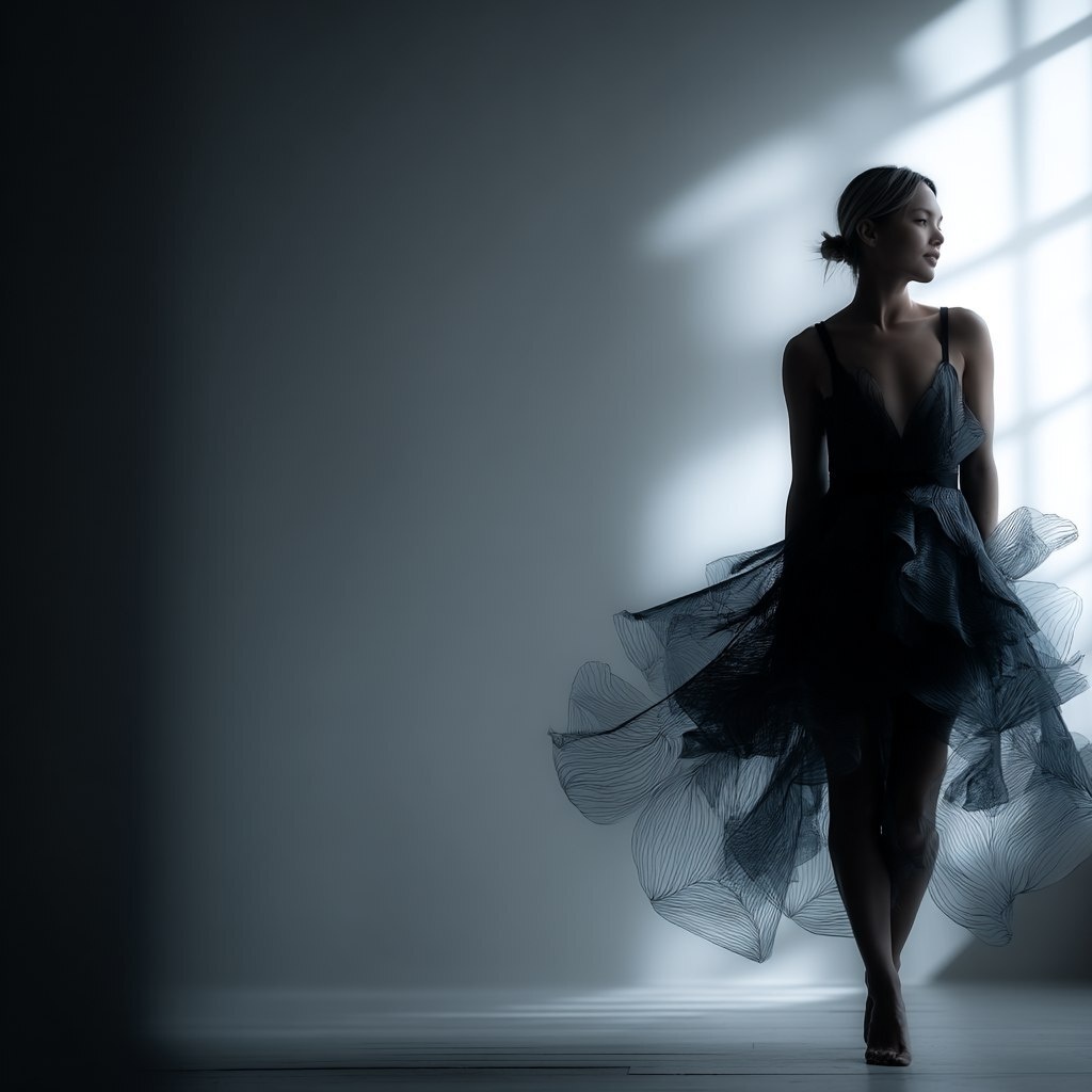 Создано на основе запроса: minimalist black light haute couture full body standing ethereal serene charybdis crustacean colored fashions