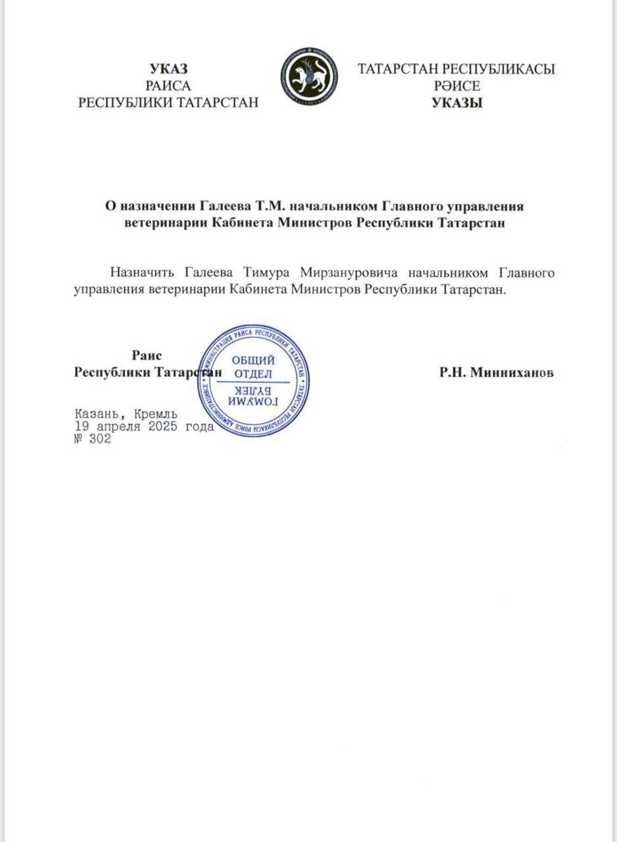 🇷🇺📄Раис Татарстана подписал указ о назначении начальника Главного управления ветеринарии Кабинета Министров Республики Татарстан Им назначен Галеев Тимур Мирзанурович. @tatmediaofficial