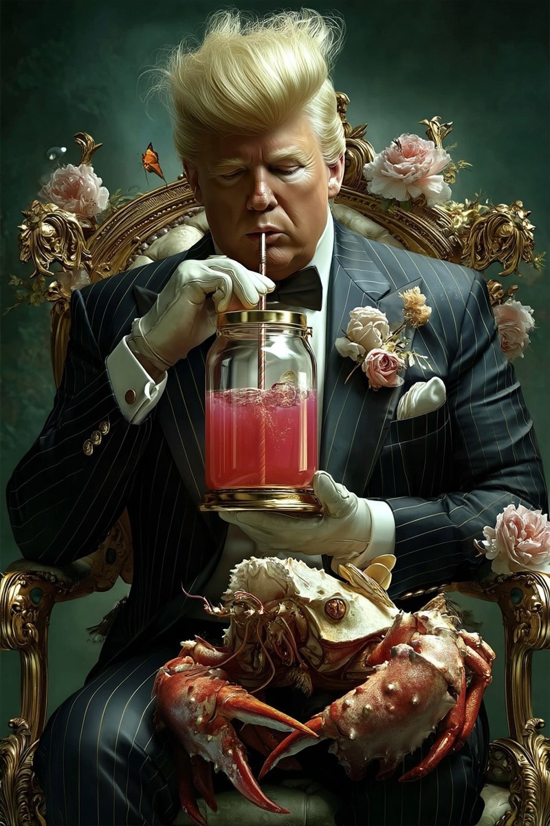 Создано на основе запроса: ronald lump fat man in a suit with blonde hair drinks the crustacean juice with a straw