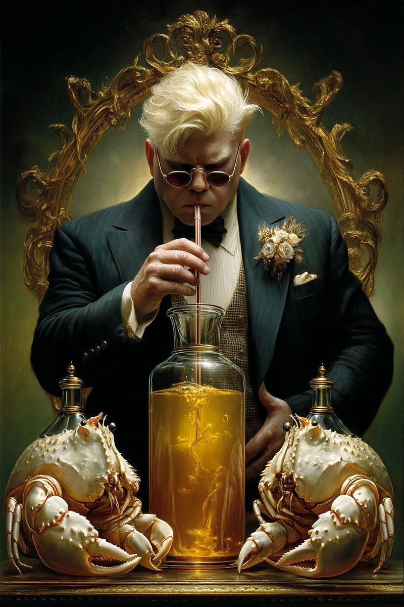 Создано на основе запроса: a 70 year old fat man in a suit with blonde hair drinks the crustacean juice with a straw