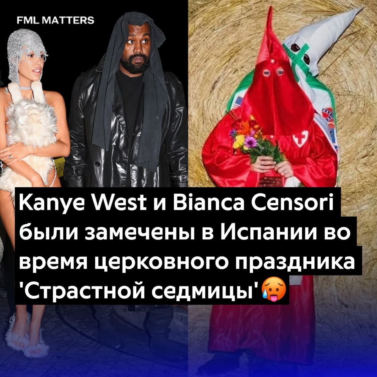 ❗️ KANYE WEST И ЕГО ЖЕНА ОТМЕЧАЮТ ПАСХУ! По сообщениям СМИ, Йе и Бьянка были замечены вместе в Испании во время Пасхальной недели, несмотря на заявление Йе о расставании, вызванном его твитами. В Испании в эти дни проходят многочисленные религиозные процессии. 💀 FML MATTERS