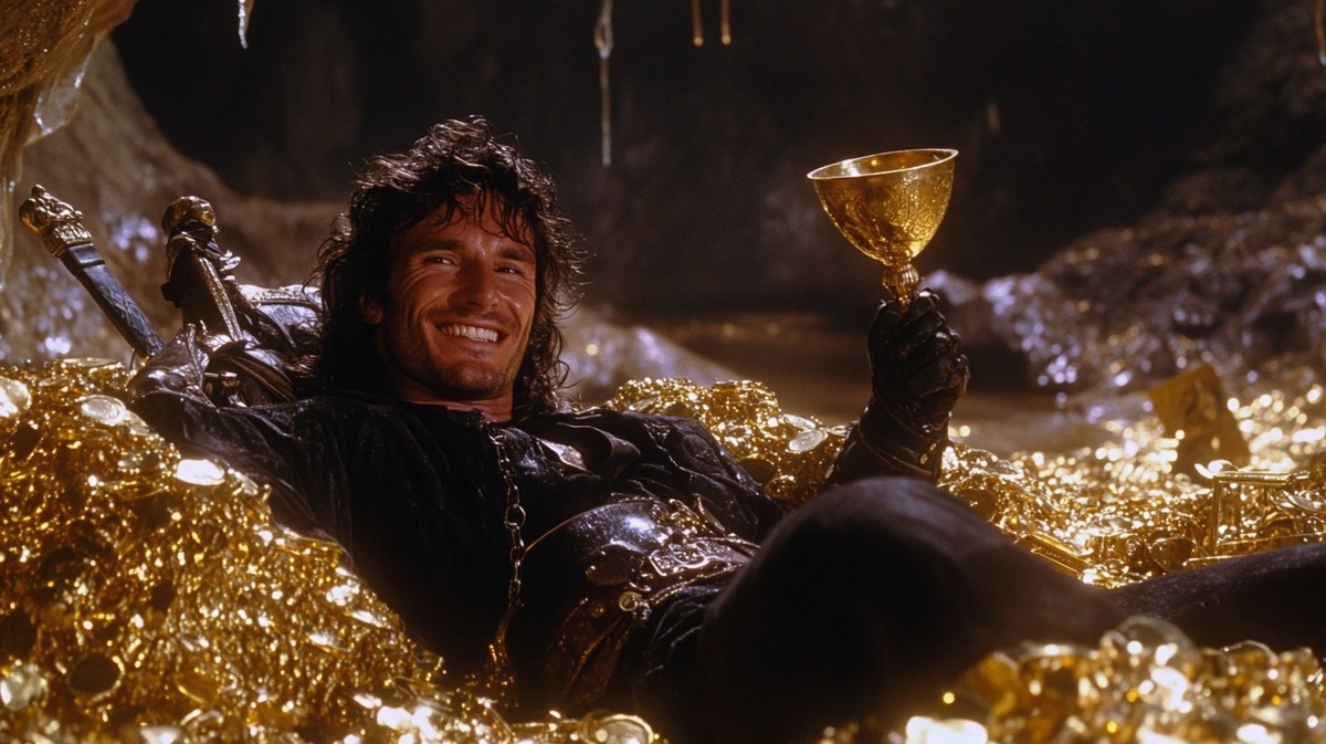 Создано на основе запроса: a single frame from a 1980s dark fantasy film, close up a happy ranger wearing dark clothing large sword strapped on back, clean shaven, sitting in a massive pie of gold, treasure chests, gold chalice in hand, wet cave background --- Автоперевод: Единая кадра из фильма Dark Fantasy 1980 -х годов, прикрытый счастливого рейнджера в темной одежде. Хорошо получилось? 🤔 https://dzen.ru/id/65c0c65c86e4f837c27b24d7 #ИИ #AI #нейросеть #midjourney #art