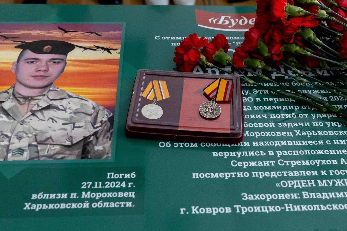 «Будем жить», — так всегда говорил Артём Стремоухов. Эти слова служили и девизом при выполнении боевых задач. Артём учился в Куровской гимназии. Творческий парень, любил играть на гитаре, читал стихи и поэмы, мечтал поступить в театральный. В 2020 году был призван на срочную военную службу и проходил её в роте РЭБ (радиоэлектронная борьба), был оператором БПЛА. По истечении срока службы подписал контракт в том же подразделении. В июне 2022 года отправился в зону специальной военной операции. Артём погиб 27 ноября 2024 года, выполняя боевое задание. Удостоен ордена Мужества посмертно. В стенах его родной гимназии открыли Парту Героя. Право сидеть за ней получат учащиеся за отличные успехи в учебе и спорте, а также за активную общественную работу. На церемонии присутствовали родители и брат Героя, ученики и преподаватели гимназии, руководитель депутатского объединения партии «Единая Россия» в Совете депутатов округа Дмитрий Нестеров, социальный координатор Государственного фонда «Защитни