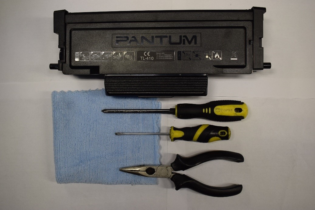 Всем доброго дня. Сегодня будет маленькая инструкция по заправке картриджа Pantum TL-420. Есть несколько моделей картриджей Pantum которые отличаются только чипом, в остальном они идентичны. Для начала подготовим все инструменты Приступаем к разборке. Раскручиваем шурупы с помощью крестовой отвертки с левой стороны тонер-картриджа. Снимаем эту боковую крышку, поддев пару защёлок. P.S.1 Не бойтесь их сломать, если они отвалятся, катастрофы не произойдёт Дальше снимаем пластиковую планку Откручиваем с помощью крестовой отвертки болт, который удерживает крепление вала подачи тонера с тонер-картриджем. Аккуратно поддеваем шлицевой отверткой крепление. Чтобы достать вал подачи тонера, нам нужно поддеть ось вала со стороны снятого крепления, а после тянем его влево. Чистим его с помощью тряпки протирочной. Под валом подачи тонера, находится дозирующее лезвие. Его край нужно хорошенько почистить от запёкшегося на нем тонера. P.S.2 Если лезвие не почистить, то при печати будут вертикальные бе