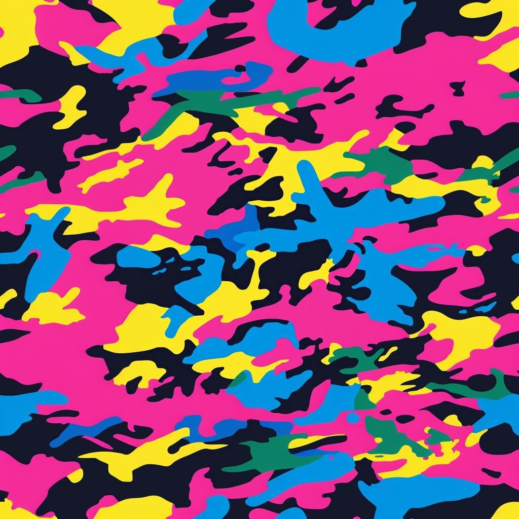 Создано на основе запроса: military camouflage pattern in neon colors like pink, blue, yellow, and green, reminiscent of the 1990s and 2000s --- Автоперевод: Военный камуфляжный рисунок в неоновых цветах, таких как розовый, синий, желтый и зеленый, напоминающий 1990 -х и 2000 -е годы Классно выглядит? 🤔 https://dzen.ru/id/65c0c65c86e4f837c27b24d7 #ИИ #AI #нейросеть #midjourney #art