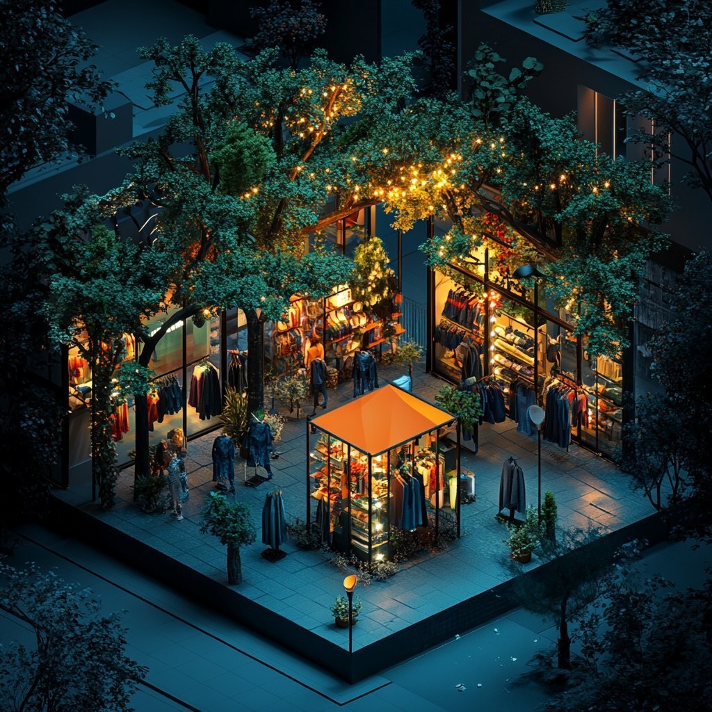 Создано на основе запроса: in a dark scenario, a clothing store design with trees and lighting on top of the roof, with customers shopping