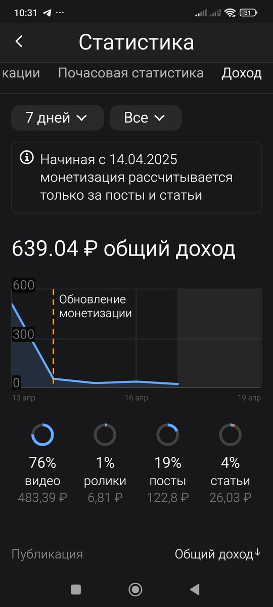 Дорогие, друзья! Хочу поделиться с вами статистикой Дзена на сегодняшний день! Это данные за неделю. По шкале отчётливо видно, как после отмены монетизации шкала рухнула вниз по всем фронтам! 483руб это была последняя оплата, да ещё за несколько дней. И что же мы видим сейчас? 26 рублей за две статьи которые я написала! 13 рублей за статью!! Дзен, ты серьёзно?!! Они попрощались с видеоблогерами, оставив их на произвол судьбы, а точнее на содержание подписчиков 🤬, придумав Премиум и донаты. Сослались, что 70% подписчиков Дзен любят тут читать только статьи и посты, вот на них то теперь и будет делиться весь доход от рекламы, которую Дзен пихает пачками! И теперь доход теперь будет делиться между пишущими блогерами. Раньше я как то не вникала в эту тему, теперь я понимаю почему пишущие блогеры полностью удаляют свои каналы на Дзен, стирая все свои статьи и удаляя фотографии. Наткнулась на комментарии под постом самого Дзена. Среди пишущих блогеров есть профессиональные писатели, журн