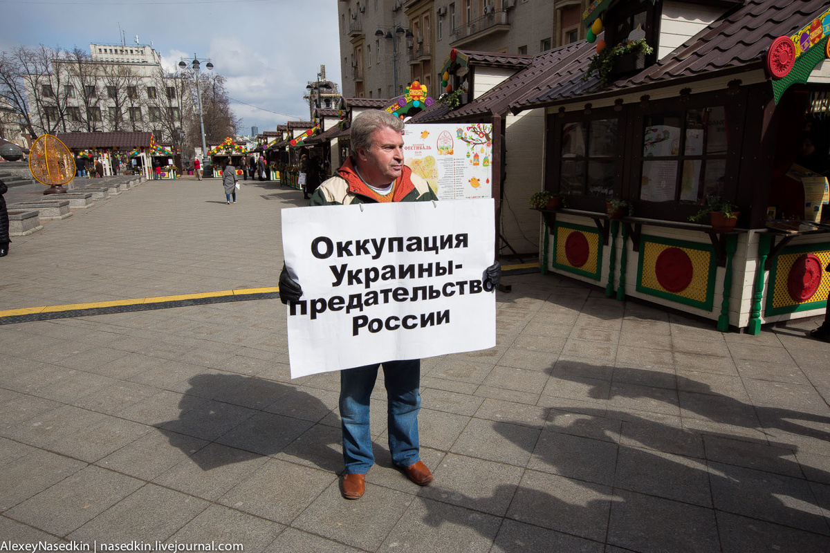 Совсем вегатарианское время было тогда. Сейчас, по прошествии десятилетия, это особенно заметно. Впрочем, в далёком теперь 2015-м многие искренне возмущались закручиванием гаек в отношении хоть как-то несогласных с линией партии и правительства, но при этом планомерно отстаивали свою позицию. 19 апреля 2015 года в Москве при поддержке "Комитета протестных действий" прошла серия одиночных пикетов в центре столицы. Как известно, мэрия отказала оппозиционерам в намеченном массовом шествии, а от переноса его в другое место отказались уже сами протестующие. Ну а одиночные пикеты у нас пока ещё не запрещены. Примерно с 14.00 одинокие граждане встали с плакатами вдоль Тверской улицы, а позже проследовали к Большому Москворецкому мосту, к месту гибели Бориса Немцова.