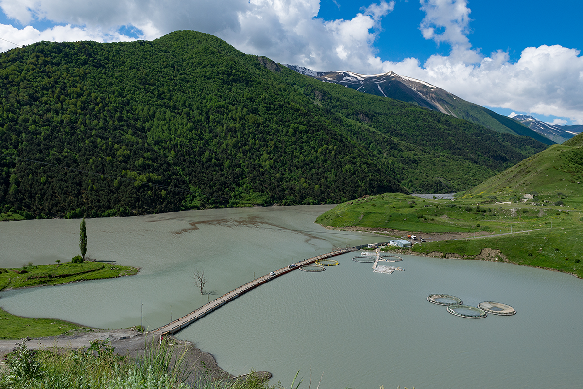 Раньше к садкам можно было проехать через аварийный тоннель — мимо головной станции Зарамагской ГЭС. Сейчас он на реконструкции, поэтому для жителей горных сел по зеркалу водохранилища пару лет назад временно проложили понтонный мост. Сегодня в хозяйстве — «рыбный день». В садки выпускают несколько тысяч штук радужной форели. На берегу водоема стоит грузовик с белоснежными баками с функцией термоса. Форель очень чувствительна к температуре: если во время перевозки она будет расти, рыба может погибнуть. А перед выпуском в садки обязательно проводят процесс «проливки», объясняет генеральный директор компании «Аквастрой» Георгий Агнаев.