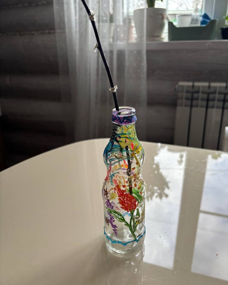 Решили с детьми дать вторую жизни для бутылки из-под газировки.🥤 🩵Получился вот такой арт-объект. ☀️А всего-то нужна была одна стеклянная бутылка и акриловые маркеры. ✨Вторичное использование стеклотары - как первый шаг к осознанному использованию ресурсов. #М_творчество