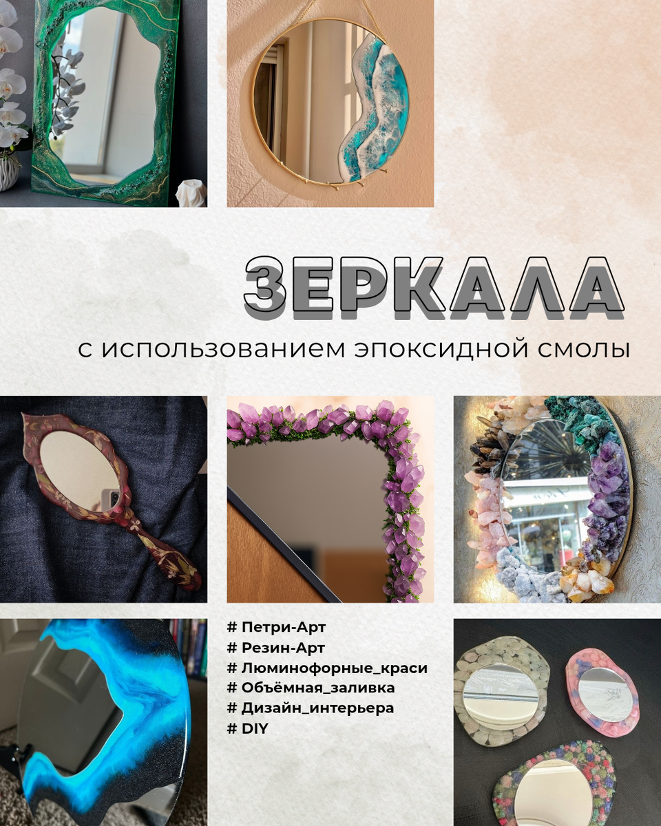 Эпоксидная смола — это настоящий тренд в мире дизайна, который нашел свое применение в декорировании мебели, интерьеров и различных декоративных предметов. В этой статье я расскажу о пяти уникальных техниках украшения зеркал с использованием смолы, которые добавят вашему пространству изысканности и индивидуальности. Все примеры вдохновлены известными техниками, а также реальными проектами, с подробными источниками, которые помогут вам вдохновиться и создать нечто невероятное. Если вы хотите привнести в интерьер элементы природы, зеркала с каменной имитацией — это то, что вам нужно. В этой технике создается эффект среза камня, который прекрасно смотрится как на овальных или прямоугольных, так и на зеркалах свободной формы. Смола окрашивается в различные оттенки, а затем наносится слоями, позволяя ей органично смешиваться и образовывать узоры, напоминающие природные минералы и камни. Я использовала этот метод для оформления подносов в технике Резин-Арт и могу сказать, что результат всегд