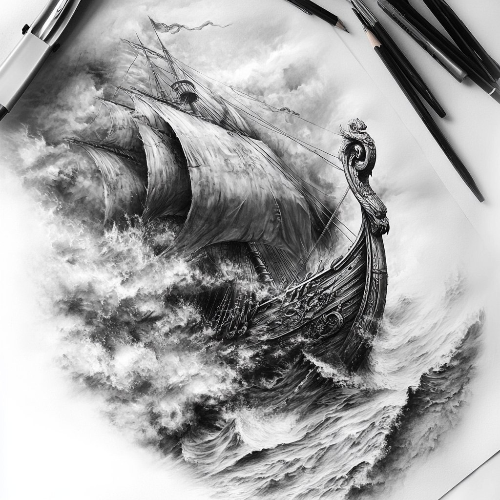 Создано на основе запроса: tattoo design , of a vikingship in heavy stormy weather , hyperrealistic, 3d, 8k , Many details, pencil drawing