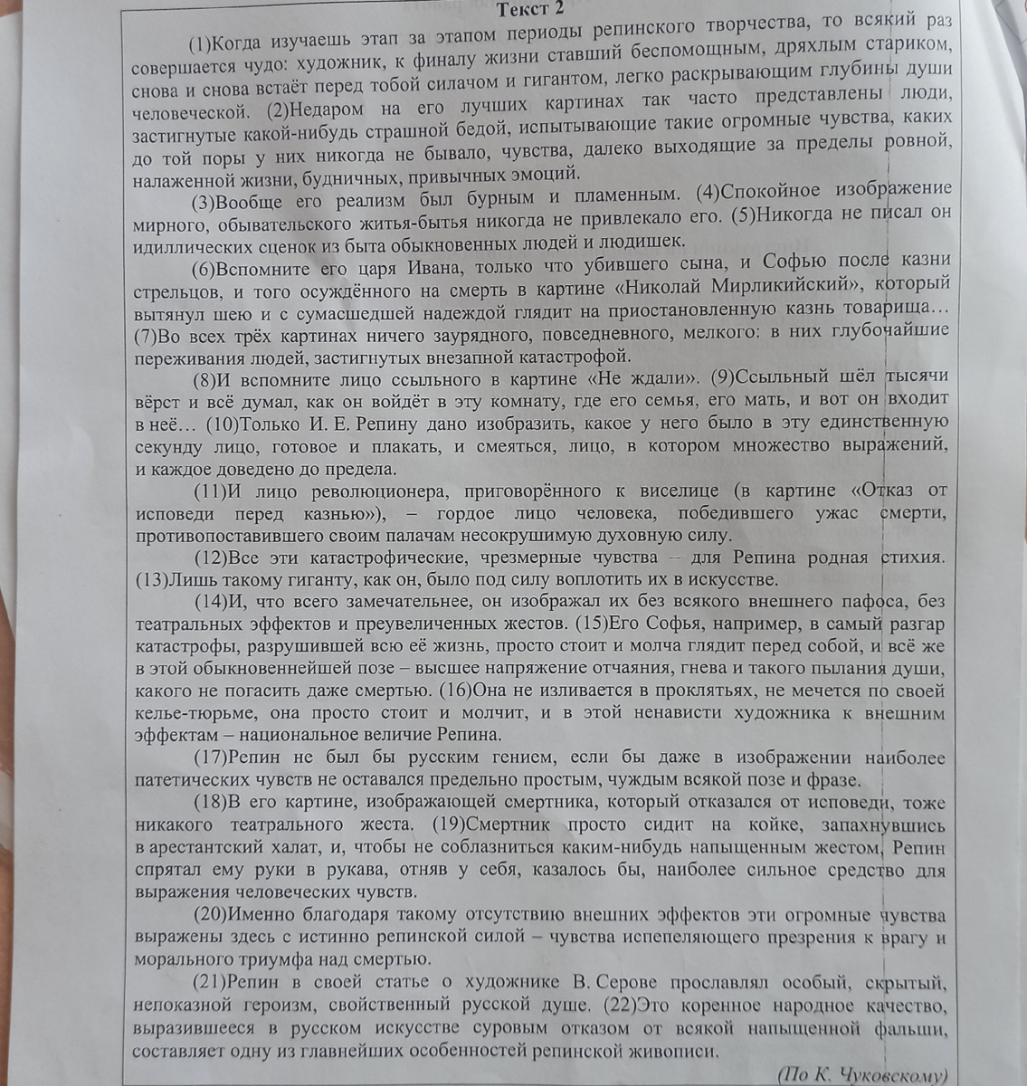 В чём своеобразие репинского творчества? На этот вопрос даёт ответ в своём тексте К.Чуковский. Автор считает, что великий художник обладал мастерством передачи самых сильных человеческих чувств.