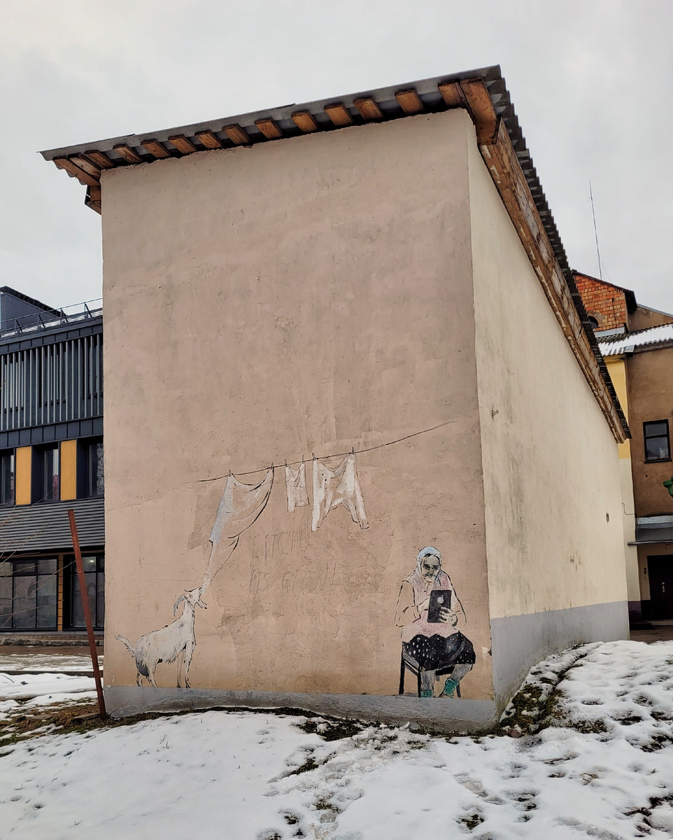 Продолжаю. Начало в предыдущей статье — вот тут. Это же город Шагала. Поэтому творческий. По муралам можно отдельные экскурсии устраивать. Их много. Мы сами себе организовали квест-прогулку с поиском стрит-арта. Особенно понравилась бабушка с айпэдом и козой, стягивающей бельё. А сын Ивана Васильевича оценил. ...квартал Малевича. Ориентир — улица Марка Шагала — всё логично, да. Где один, там и второй. Хотя у двух художников было не всё гладко, и конфликт случился как раз в Витебске. Автор «Чёрного квадрата» приехал сюда преподавать в художественном училище, созданном Шагалом. ...его оттуда. А потом бросил и учебное заведение, и город. Но спустя годы современные художники вот так примирили обоих гениев в одном квартале, где рядом цитаты Шагала и супрематизм Малевича. И всё это в окрестностях как раз того самого бывшего художественного училища. ...как на знаменитой картине «Над городом» можно на ратуше. Ну то есть купив билет и поднявшись. Мы как-то удачно подошли в нужное время и сразу