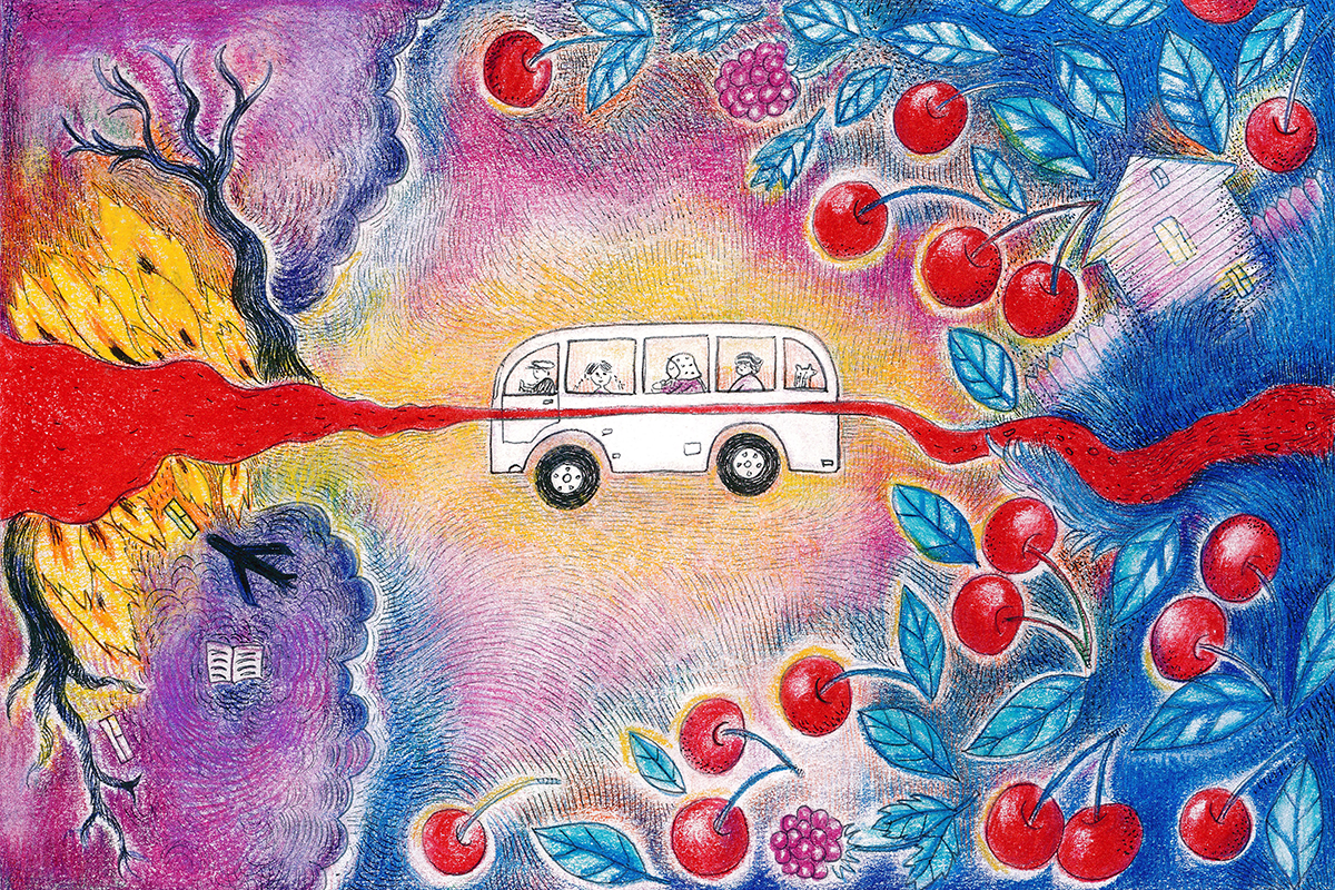 Июль 1983 года. Белый пазик и пыль, а где-то в середине сердитая конопатая девочка двенадцати лет. Просто немного еще побыть там. Обнять маму, расспросить бабушку про злой орех, увести клубничину из-под носа у ящерки. Пяти минут мне бы хватило.