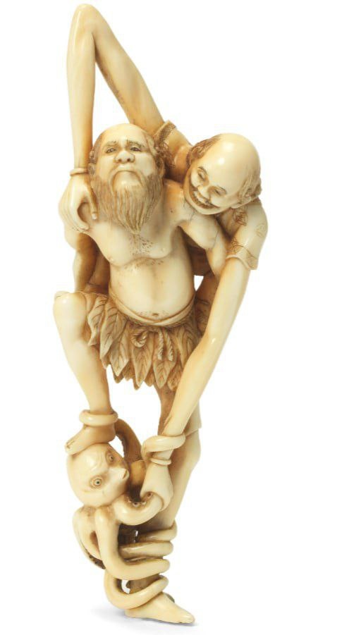 A large ivory okimono-style netsuke of Ashinaga and Tenaga by Chikuyosai Tomochika II, Edo, late 19th century. A wood netsuke of Ashinaga and Tenaga. Late 18th/early 19th century. A wood netsuke of Ashinaga and Tenaga. Early 19th century. NETSUKE EN BOIS REPRÉSENTANT ASHINAGA ET TENAGA Fin du XVIIIe siècle. Two wood netsuke Edo period (19th century). 👔Рубрика #Сюжеты и категории