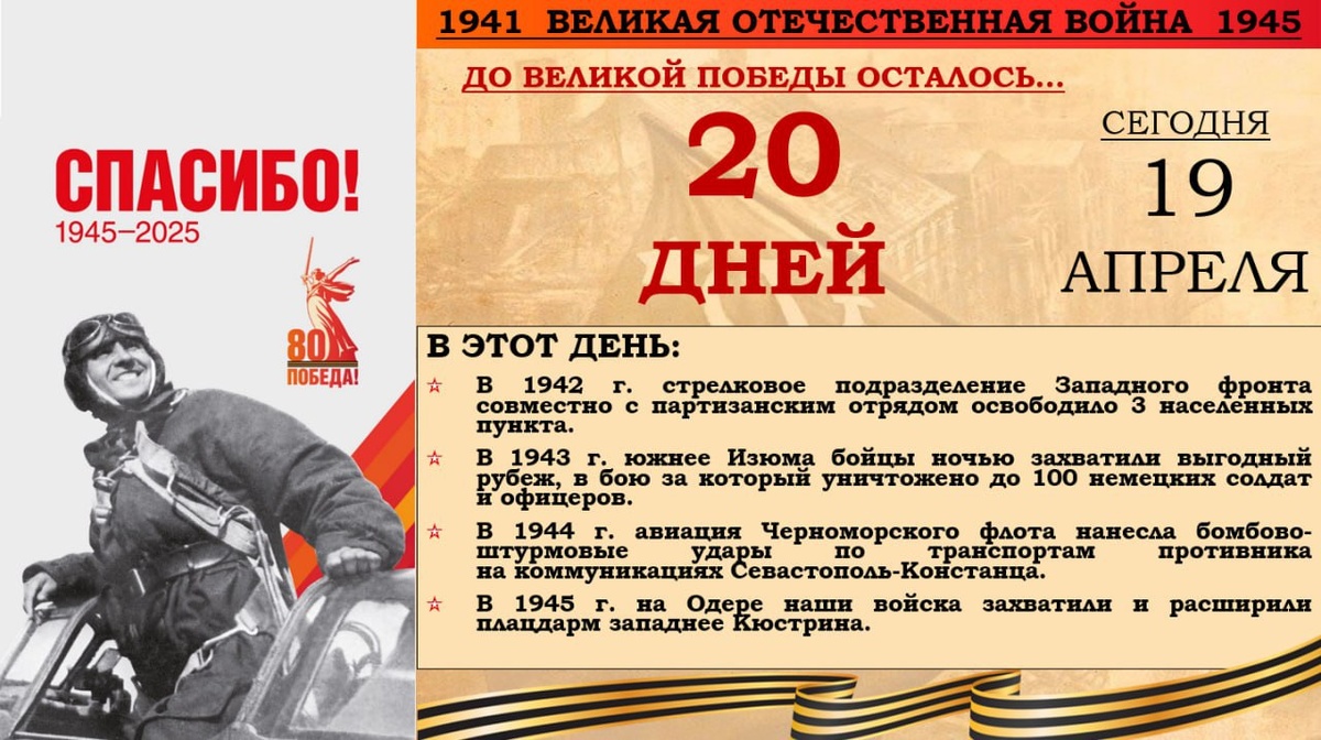 ⚡️ Годовщина Великой Победы приближается! В 1398 день войны, 19 апреля 1945 года завершен прорыв вражеской обороны, началось окружение главных сил берлинской группировки противника. На дрезденском направлении наши войска форсируют реку Нейсе. Занят город Ротенбург. Продолжается успешное наступление в Чехословакии. Советская подводная лодка потопила транспорт противника «Роберт Мюллер». Всего, на фронтах в этот день было подбито и уничтожено 129 немецких танков. В воздушных боях и огнем зенитной артиллерии сбито 140 самолетов противника. Отметим годовщину Победы советского народа в Великой Отечественной войне вместе!
