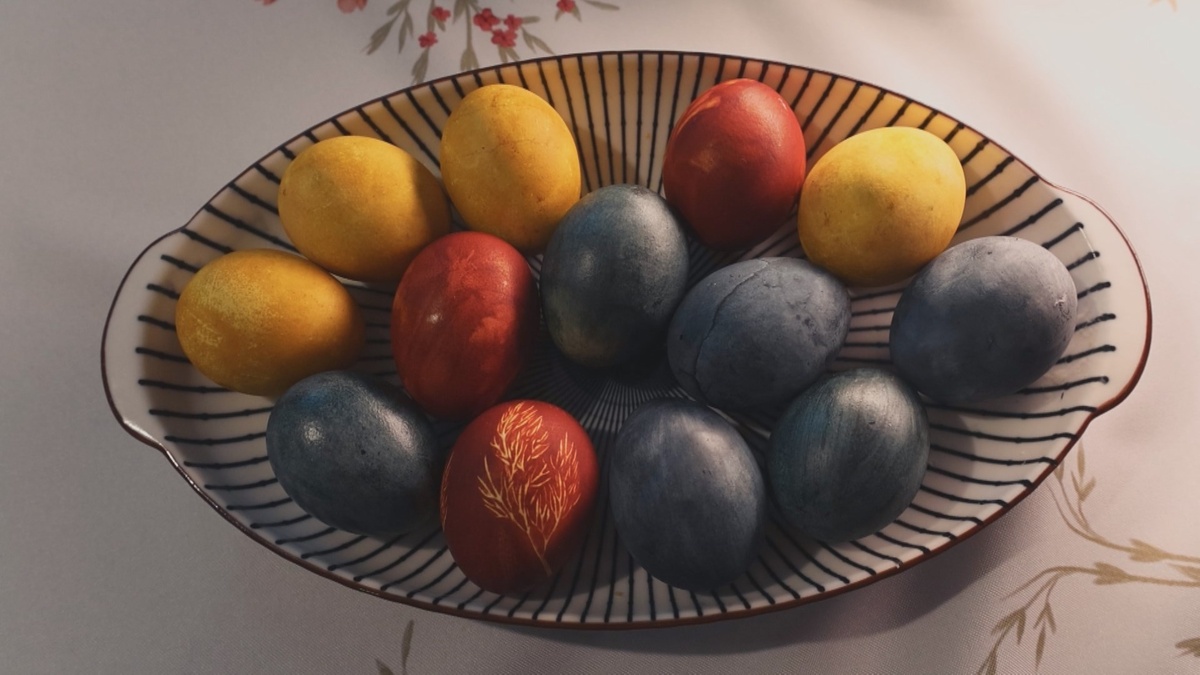 «А в этом году мы решили поэкспериментировать – покрасили яйца в глубокий синий цвет в растворе чая каркаде. Такой он сложный, с разводами», – Светлана Лепешенкова, жительница г. Щелково.