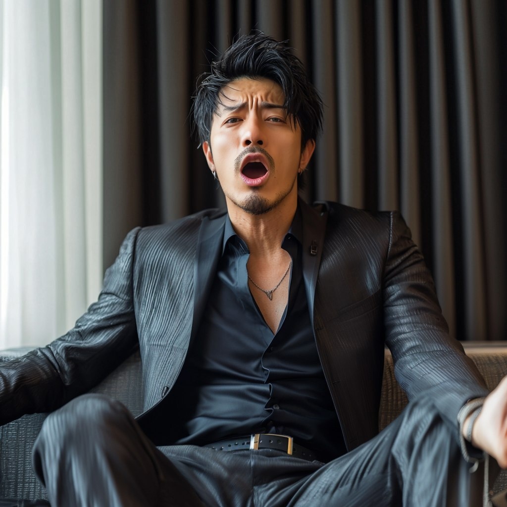 Создано на основе запроса: very handsome Japanese man,Sitting on the sofa, suit, belt, anger, earrings