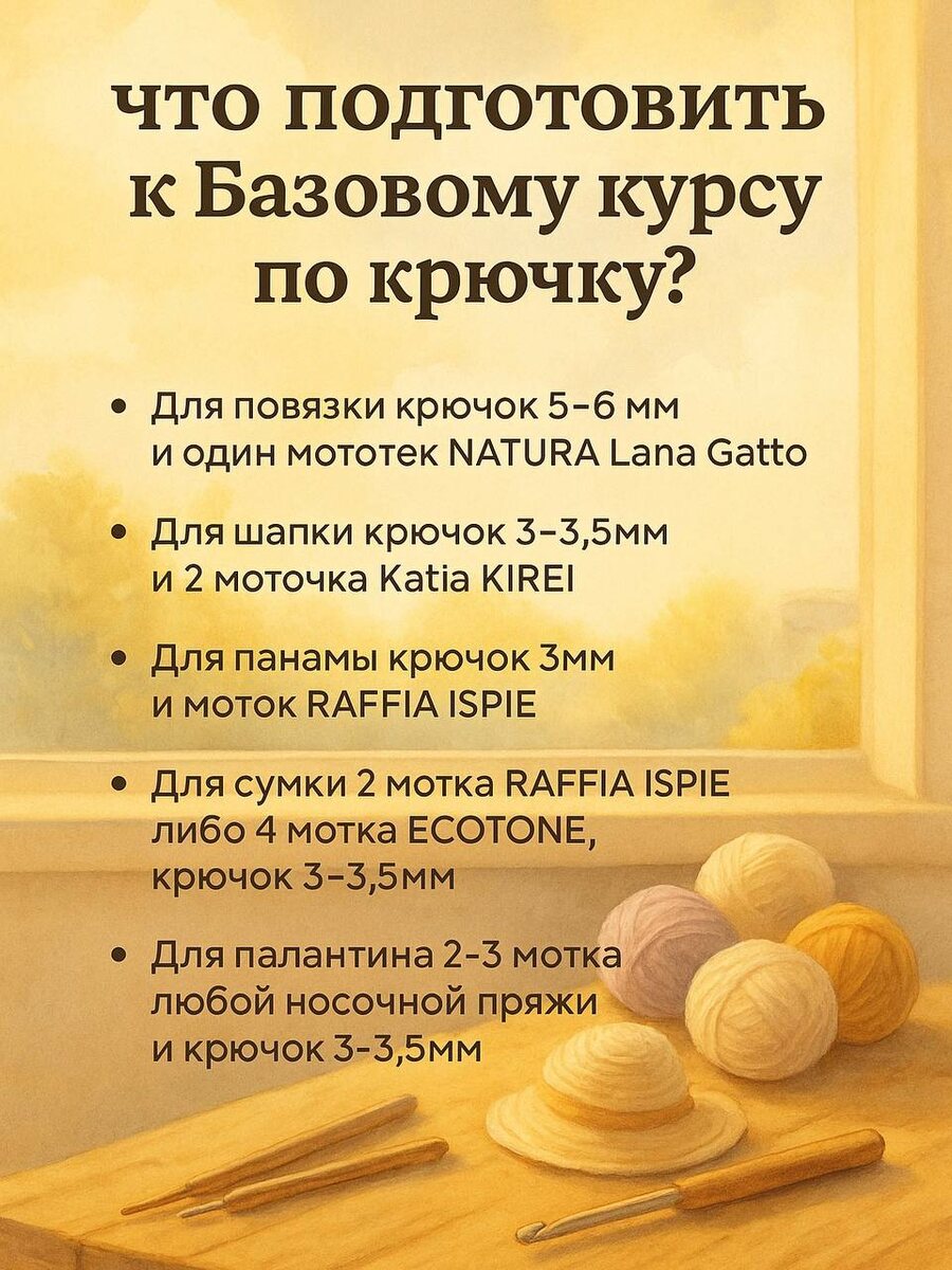 ΡΠ°Π½ΡΠΉΡΠ΅ ΡΡΠΎΡ ΠΏΠΎΡΡ ΠΈ ΠΊΠ°ΡΡΠΈΠ½ΠΊΡ β ΡΡΠΎ ΠΏΠΎΠ»Π½ΡΠΉ ΡΠ΅ΠΊ-Π»ΠΈΡΡ ΠΏΠΎ ΠΏΡΡΠΆΠ΅ ΠΈ ΠΊΡΡΡΠΊΠ°ΠΌ, ΠΊΠΎΡΠΎΡΡΠΉ ΠΏΠΎΠΌΠΎΠΆΠ΅Ρ Π²Π°ΠΌ ΠΏΠΎΠ΄Π³ΠΎΡΠΎΠ²ΠΈΡΡΡΡ ΠΊ Π·Π°Π½ΡΡΠΈΡΠΌ Π±Π΅Π· ΡΡΠ΅ΡΡ. ΠΡ ΠΌΠΎΠΆΠ΅ΡΠ΅ ΠΈΡΠΏΠΎΠ»ΡΠ·ΠΎΠ²Π°ΡΡ Π½Π°ΡΠΈ ΠΏΡΠΎΠ²Π΅ΡΠ΅Π½Π½ΡΠ΅ Π°ΡΡΠΈΠΊΡΠ»Ρ ΠΈΠ»ΠΈ ΠΏΠΎΠ΄ΠΎΠ±ΡΠ°ΡΡ Π°Π½Π°Π»ΠΎΠ³ΠΈΡΠ½ΡΡ ΠΏΡΡΠΆΡ ΠΏΠΎ ΡΠΎΡΡΠ°Π²Ρ ΠΈ ΠΌΠ΅ΡΡΠ°ΠΆΡ β Π³Π»Π°Π²Π½ΠΎΠ΅, ΡΡΠΎΠ±Ρ Π²Π°ΠΌ Π±ΡΠ»ΠΎ ΠΏΡΠΈΡΡΠ½ΠΎ ΠΈ ΡΠ΄ΠΎΠ±Π½ΠΎ Π²ΡΠ·Π°ΡΡ. πΆΠΠΎΠ²ΡΠ·ΠΊΠ° βοΈΠΡΡΠΆΠ°: 50ΠΌ Π² 50Π³ (ΠΎΠ±ΡΡΠΌΠ½Π°Ρ ΠΈ ΠΌΡΠ³ΠΊΠ°Ρ), Π²ΡΠ΅Π³ΠΎ 50Π³ βοΈΠΠ°Ρ Π²ΡΠ±ΠΎΡ: Natura ΠΎΡ Lana Gatto βοΈΠΡΡΡΠΎΠΊ: 5β6 ΠΌΠΌ πΆΠ¨Π°ΠΏΠΊΠ° βοΈΠΡΡΠΆΠ°: 90β125ΠΌ Π² 50Π³, Π²ΡΠ΅Π³ΠΎ 150Π³ βοΈΠΠ°Ρ Π²ΡΠ±ΠΎΡ: Super Soft / Maxi Soft ΠΎΡ Lana Gatto, Kirei Color ΠΎΡ Katia βοΈΠΡΡΡΠΎΠΊ: 3β3,5 ΠΌΠΌ πΆΠΠ°Π½Π°ΠΌΠ° βοΈΠΡΡΠΆΠ°: Raffia Ispie β 1 ΠΌΠΎΡΠΎΠΊ (250ΠΌ / 190Π³) βοΈΠΠΈΠ±ΠΎ Π°Π»ΡΡΠ΅ΡΠ½Π°ΡΠΈΠ²Π°: ΡΡΠ°Π±ΠΈΠ»ΡΠ½Π°Ρ Π½Π΅ΠΏΡΡΠΈΡΡΠ°Ρ ΠΏΡΡΠΆΠ° Π½Π° Ρ