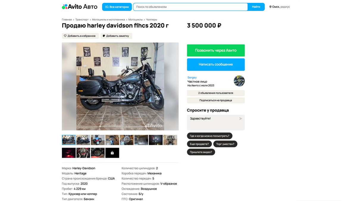 Байк куплен новым и дополнительно усовершенствован знаменитым оборудованием. На сайте объявлений «Авито» появился уникальный лот – легендарный американский байк Harley-Davidson Heritage Classic 114 2020 года выпуска. Купить мотоцикл предлагается за 3,5 млн рублей. FLHCS Heritage является одним из наиболее известных мотоциклов бренда Harley-Davidson. Эта модель объединяет традиционный внешний вид, впечатляющую мощность двигателя и высокий уровень удобства для дальних поездок по дорогам. Модель оснащена мотором объемом 1868 куб. см и мощностью 94 л.с. Привод мотора осуществляется ремнем, трансмиссия – механическая с пятью ступенями переключения. Дополнительно установлены фирменная система воздушного охлаждения, инжекторная подача топлива и антиблокировочная тормозная система. Этот Harley-Davidson – не обычный подержанный мотоцикл. Куплен абсолютно новым у официального представителя в Новосибирске, бережно использовался владельцем: общий пробег всего 4229 километров, сервис проходил регул