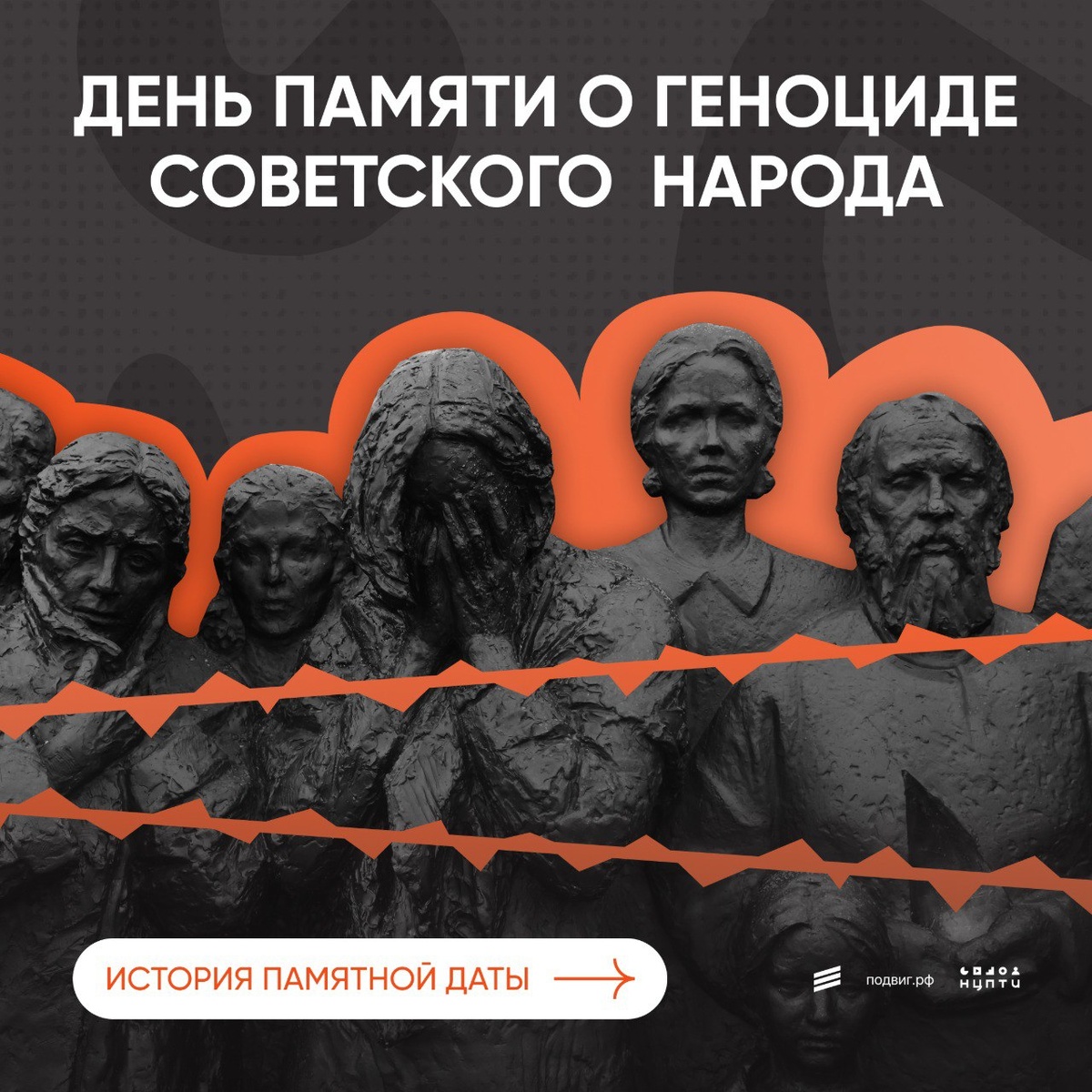 🗓 19 апреля — День единых действий в память о геноциде советского народа в годы Великой Отечественной войны Массовые убийства мирного населения были тщательно спланированными и систематическими карательными операциями. Их проводили сторонники гитлеровского режима на оккупированных территориях. Важно сохранить память о жертвах немецко-фашистских захватчиков и доносить информацию до подрастающего поколения. О появлении памятной даты читайте в карточках! Полезные материалы: — Социальный видеоролик «Росток» — О законах, защищающих историческую память ВОВ 🌐 НЦПТИ | Подвиг.РФ
