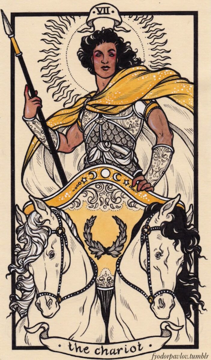 "Колесница — очень активная карта, очень динамичная, указывающая на быстрое развитие событий, в том числе в отношениях. Если у нас эта карта выходит на характеристику отношений, там все происходит очень стремительно. Причем не просто новые события, как мы можем говорить на Маге. Колесница — некое пересечение с Магом. Можно считать ее как некое суммирование Мага с Императором, хотя по нумерологии не получается (Маг с Императором, 1 + 4 = 5, а тут все-таки 7). Здесь нумерологический фокус не проходит, но по некому психотипу, это такой ребенок Императора и Мага, получается Колесница. Есть и активность от Мага — движение, динамика и некоторая конкретность, четкость, уверенность от Императора. Это активная карта, поэтому в этих отношениях идет бурное развитие, они быстро стремятся к какой-то цели. Но, как правило, к этой цели гонит кто-то один. Это человек, который может торопить отношения, заставлять их развиваться в нужном русле и подталкивать к браку или к чему-либо другому. Но когда вы спешите, другой человек может не совсем быть готовым к такой скорости развития. Колесница на страсти редко выходит. С точки зрения чистой теории, почему бы и нет? Карта яньская, активная; мы видим воина в колеснице, вполне себе может быть и на страсть. Но все время выходит что-то другое. Но может быть, вполне.