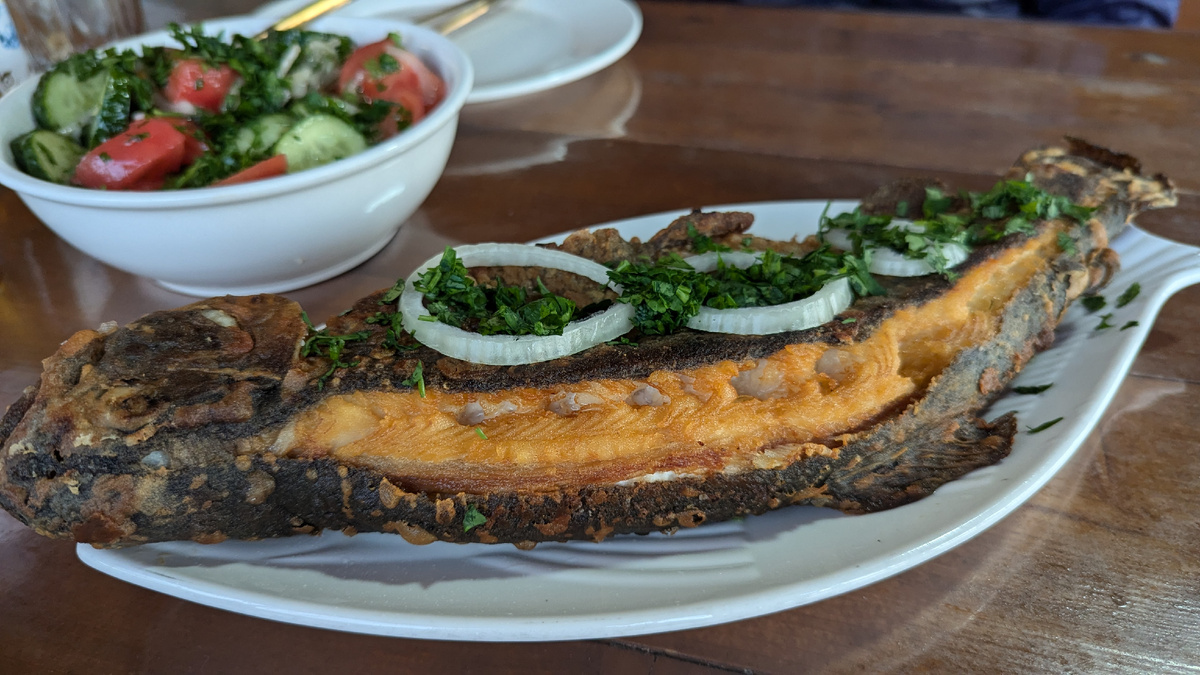 Где поесть форель в Абхазии. Рассказываю про рестораны, в которых не боюсь есть сама, и куда рекомендую поехать туристам. В Абхазии несколько форелевых хозяйств. Мое самое любимое находится в Дранде. На днях заезжали туда на ужин. Сейчас апрель 2025 года. Стоимость живой форели 130 руб /100 гр., то есть 1300 руб./кг. Очень бюджетно, я считаю. Еда на троих вышла у нас на 2000 руб.: форель, картошка по деревенски, салат, соус и лимонад. Все очень вкусное и свежее. Форелевое хозяйство находится недалеко от трассы, примерно в 25 км от Сухума. Дорога хорошая . Территория хозяйства большая ухоженная. Помимо форели плавают даже осетры На территории очень чисто. Живут весёлый пёс и 2 коня. Все упитанные и дружелюбные. Вот в таких прудах разводят рыбу. Если хочется, можно взять удочку и поймать себе форель на обед самостоятельно. Ее тут же пожарят. Очень вкусно. Соус из алычи асызбал Сесть можно на улице или внутри. Если холодно, то можно греться у камина На территории есть роскошн
