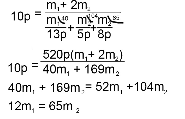 Сплав изготовили из трёх металлов, причём известно, что плотность первого металла в 1,3 раза больше плотности сплава, плотность второго металла составляет 0,5 от плотности сплава, а плотность третьего металла составляет 0,8 от плотности сплава. Массы второго и третьего металлов в сплаве одинаковы. Определите отношение массы первого металла в сплаве к массе второго металла m1:m2. Ответ округлите до десятых. Сделаем хитрый финт ушами = пусть плотность сплава будет 10р, тогда плотность 1 металла 13р, второго 5р, а третьего 8р. Ну и к нашей любимой формуле - плотность это масса деленная на объем. Объем сплава это m1+2m2, а объемы каждой из трех составляющих выражаем через массы и плотности. Ответ 5.4 Другие задачи раздела