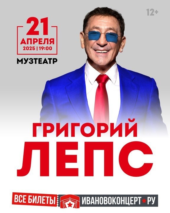 Григорий Лепс представляет большой концерт в Иванове! 🗓️ 21 апреля, 19:00 📍 Музыкальный театр️ 🎟️ Билеты доступны на сайте и в кассах «Иваново Концерт» Он брутальный и романтичный, бескомпромиссный и сентиментальный! Когда Григорий Лепс появляется на сцене, весь зал превращается в единое сплоченное пространство, эмоциями которого артист искусно управляет. Каждый его концерт — настоящее зрелище с живым звуком, цепляющее необыкновенной искренностью, с которой певец выходит на сцену, растворяясь в своих зрителях и музыке. Не пропустите, это стоит увидеть! Реклама. Буров А.А. ИНН 371104189316. erid: 2W5zFGnFnde
