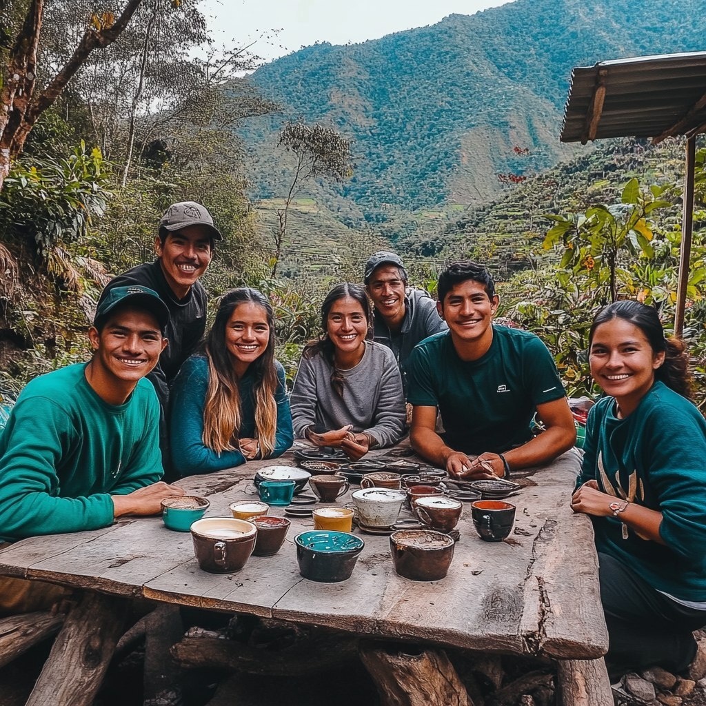 Создано на основе запроса: Genera una imagen realista de una grupo de cafetaleros en Quillabamba, Perú, con un grupo de viajeros en una