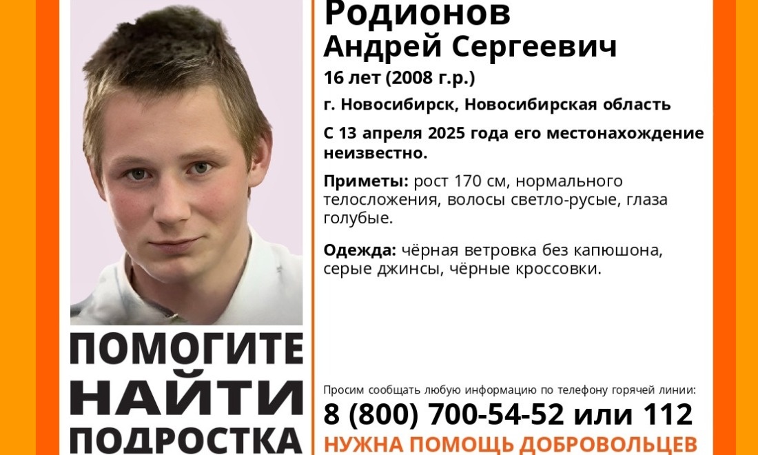 Ранее сообщалось, что 16-летний Андрей Родионов прилетел в Новосибирск из Владивостока 13 апреля и бесследно исчез, едва покинув аэропорт. Ориентировку на поиски подростка опубликовали волонтёры поисково-спасательного отряда «ЛизаАлерт Новосибирская область». Однако, как сообщило РИА VladNews со ссылкой на УМВД России по Приморскому краю, парень ушёл из дома в полдень 12 апреля. И с тех пор его местонахождение неизвестно. Прежде он никогда не сбегал от родителей и на профилактическом учёте не состоял. Местная полиция проверяет подъезды, чердаки жилых домов, гаражные кооперативы, заброшенные здания, лесные массивы. К поискам подключены приморские волонтёры. Всех, кому что-либо известно о местонахождении подростка в Новосибирске, просят сообщить об этом по телефону 112 или на горячую линию отряда по номеру 8-80(070-05) 4-52.