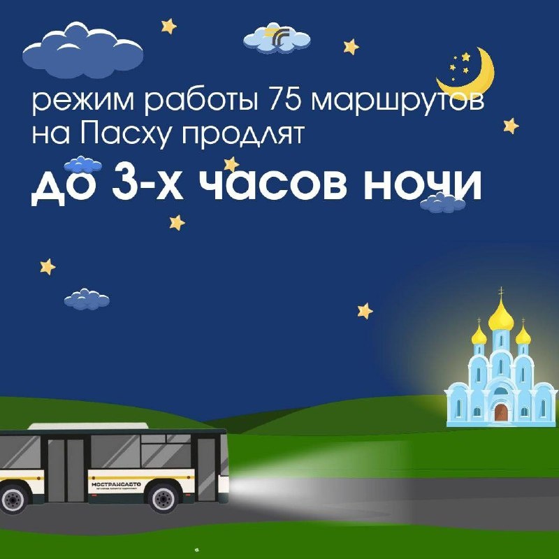 На Пасху режим работы 75 маршрутов Мострансавто до подмосковных храмов и церквей продлён до 3-х часов ночи. Также на 7 популярных маршрутах в пасхальную ночь добавят дополнительные автобусы. Перечень маршрутов доступен на сайте. ________ Присылать новость @mstislavz 👉 Обсудить в чате ЖК 👉 Подписаться на канал