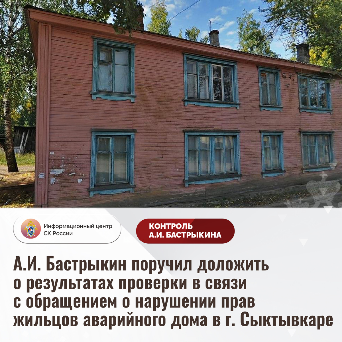 А.И. Бастрыкин поручил доложить о результатах проверки в связи с обращением о нарушении прав жильцов аварийного дома в г. Сыктывкаре В комментариях в аккаунте приёмной Председателя СК России А.И. Бастрыкина «ВКонтакте» обратилась жительница Республики Коми по вопросу длительного непринятия мер при переселении жильцов многоквартирного дома в городе Сыктывкаре. Здание, 1958 года постройки, признано аварийным и находится в непригодном для проживания состоянии ввиду значительного износа несущих конструкций, отсутствия систем водоснабжения и канализации, а также неисправности отопительного оборудования. Несмотря на то, что в 2023 году в квартире заявительницы произошло обрушение потолочных перекрытий, до настоящего времени благоустроенным жилым помещением она не обеспечена. Многочисленные обращения результатов не принесли. Ранее указанная ситуация освещалась в социальной сети. В СУ СК России по Республике Коми по данному факту проводится процессуальная проверка. Председатель Следственного к