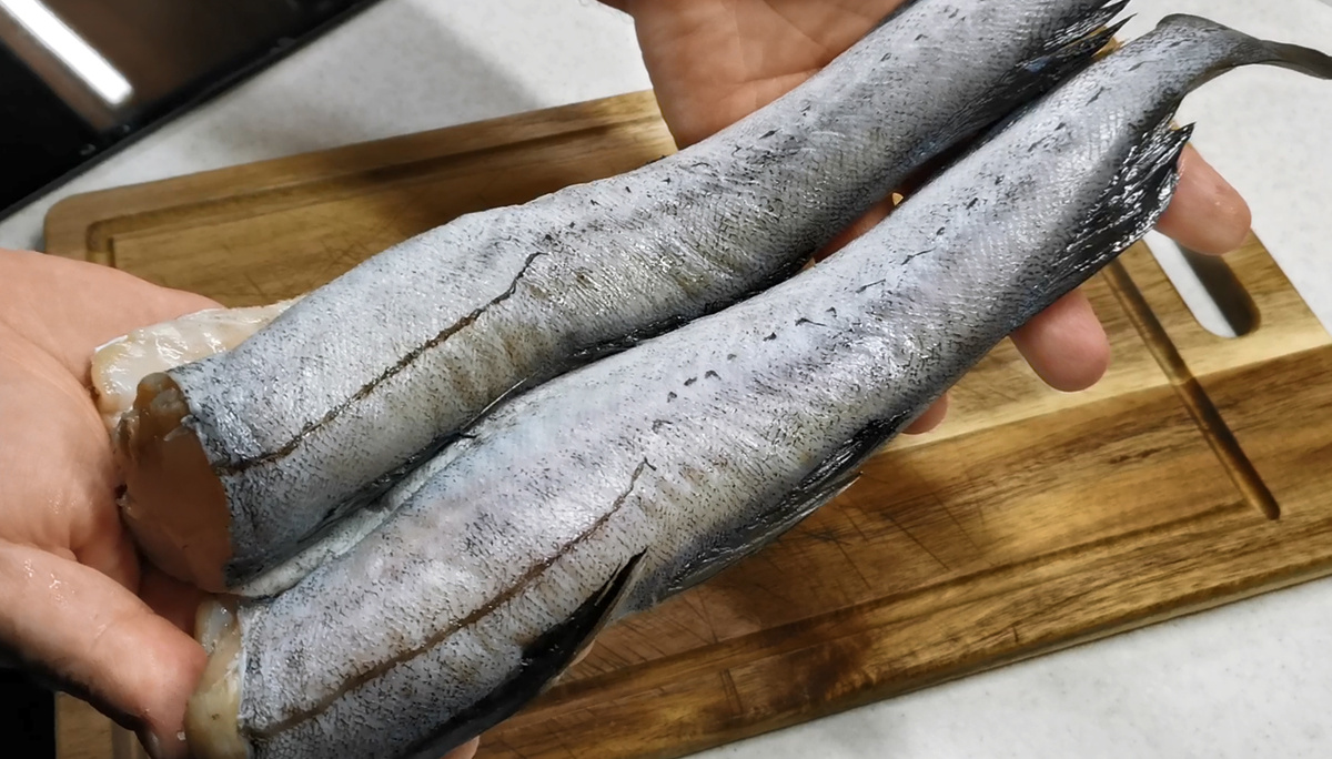 В общем, берем, как у нас тут уже принято говорить, минтай. Чистим как обычно. Скоблим шкурку, убираем черные пленки внутри, срезаем плавники и хвостики.