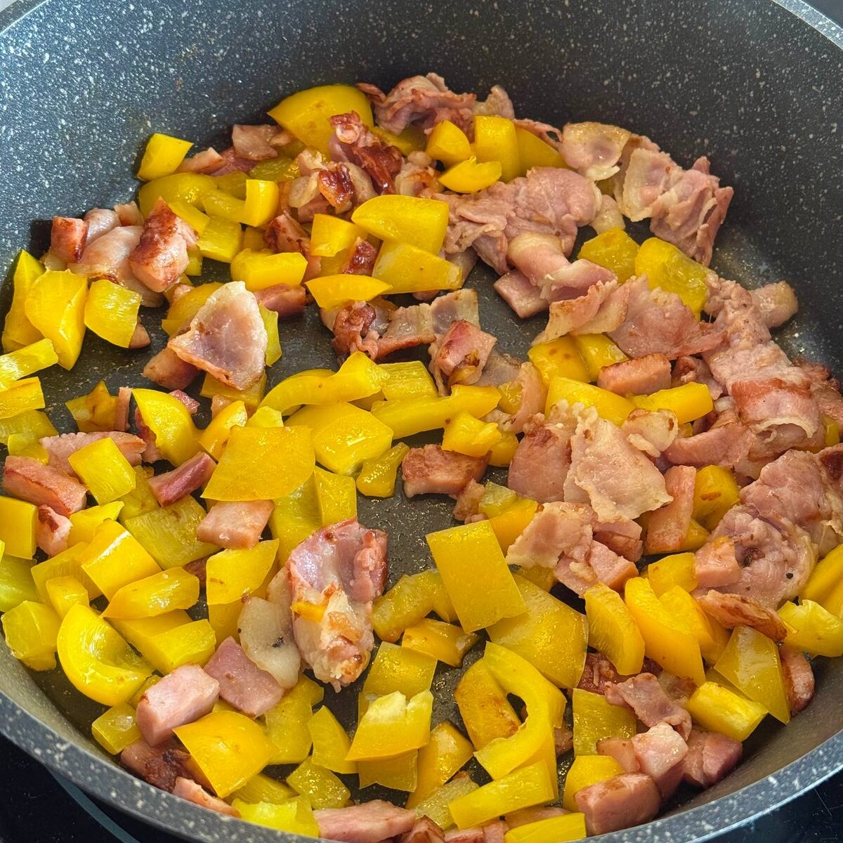 1️⃣Обжарьте вместе кусочки бекона и ветчины до золотистости.