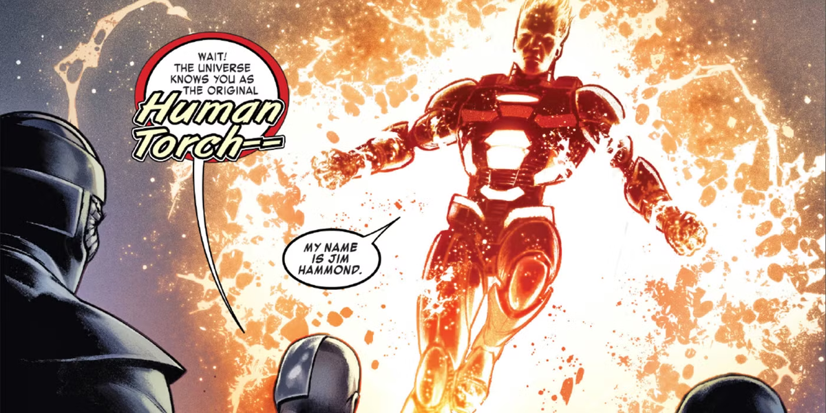 В 1939 году вышел первый выпуск «Marvel Comics», в рамках коего дебютировал Джим Хаммонд, первый, опять же, Человек-Факел. Джим был андроидом, «идеальной имитацией человека». Единственным недостатком конструкции были так называемые «Клетки Хортона» (Финеас Хортон — создатель Джима), покрывающие всё тело Хаммонда. Они были нестабильны и воспламенялись при контакте с кислородом, не нанося урон самому андроиду. Нужно сказать, что Хаммонд до сих пор жив и функционирует: одним из последних появлений стал шестой том «Железного Человека» (это март 2022 года). Вот в честь этого «героя Второй Мировой» Джон Шторм и взял себе псевдоним, ибо силы схожи.