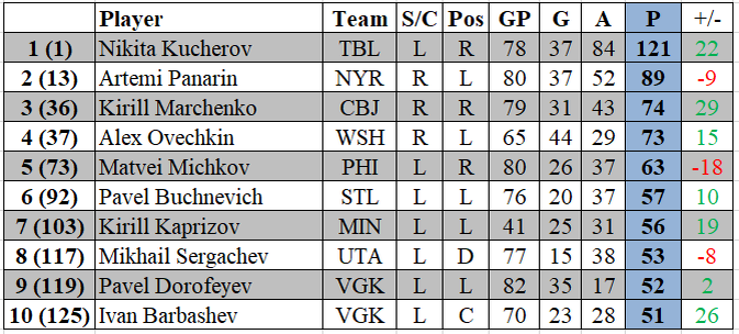 По сравнению с прошлым сезоном количество наших игроков в топ-50 стало больше на одного. В сезоне 2023/24 3 игрока вошли в 50 лучших: 1) Никита Кучеров (144 (44+100) очка в 81 матче); 4) Артемий Панарин (120 (49+71) очков в 82 играх); 11) Кирилл Капризов (96 (46+50) очков в 75 матчах).