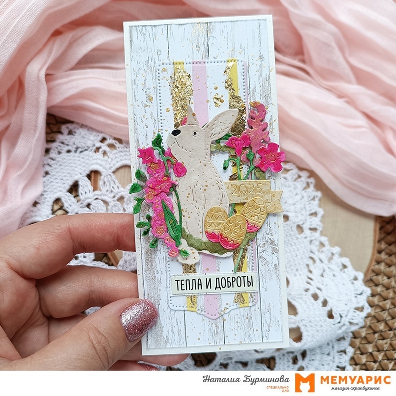 Пусть Пасха и прошла, но настроение ведь не отпускает. Так что можно ещё немного продлить мгновение и сделать открытки про запас. Тем более наше задание располагает к этому. Всем творческий привет! С Вами, Наташа. И моя вторая работа по нашему заданию - Солнечный зайчик. Такое классное задание, что наверное, это не последняя работа у меня по нему. И в главной роли, конечно, Зайка. На сей раз это элемент вырубки. Работала с ножами Mimi cut Лето в кармане и Что посеешь-то пожмёшь. Вырубку раскрасила сухими красками и акриловой краской металлик от Fractal Paint. Немного скрапбумаги от Mintay papers. Поталь. В слоях пивной картон для многослоя. Надпись из «Говорилка картонная» Поздравления. В завершении набрызг акриловой краской. Цвет: золото. Всё, открыточка готова. Обязательно участвуйте в нашем задании, и классное настроение Вам обеспечено! Спасибо за внимание и до новых встреч!